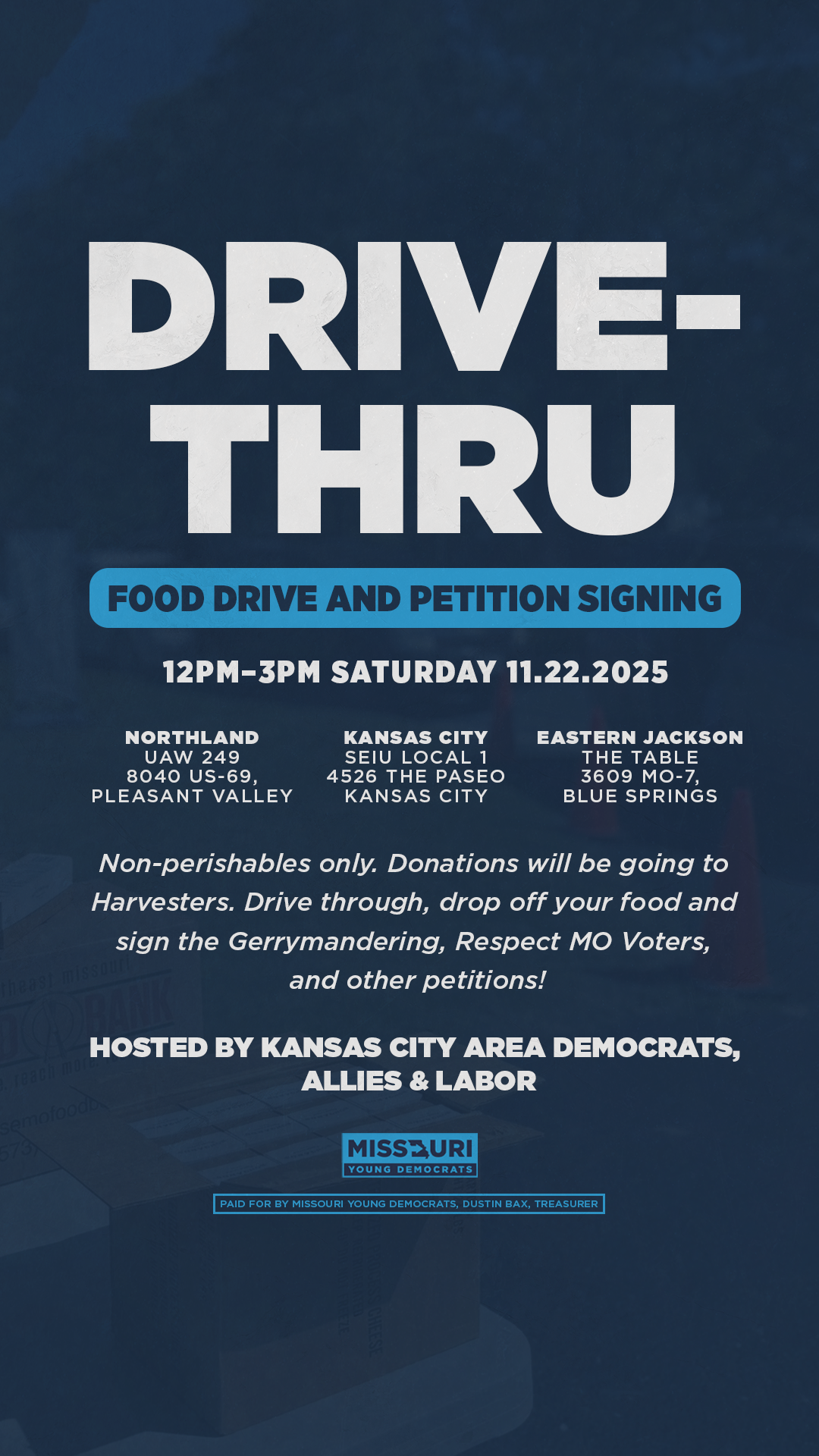 Drive through this Saturday to drop off non-perishables and sign petitions for fair maps and voter rights. Three KC-area locations. Show up and make an impact.
